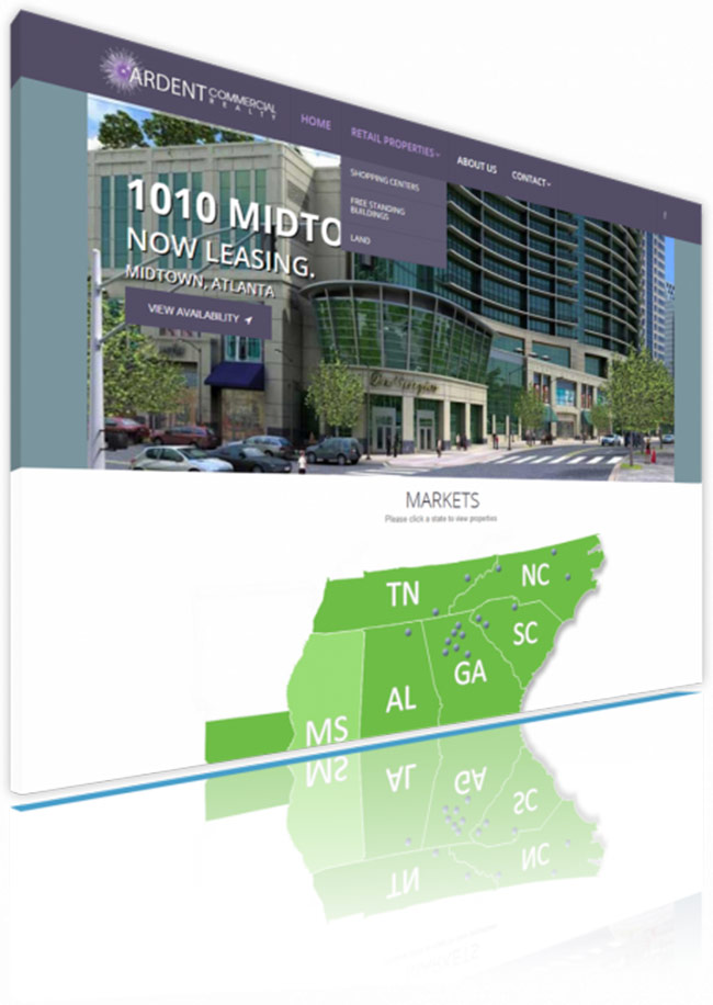 Ardent Commercial Realty needed to create a responsive website that would allow potential tenants to see available rental spaces, inquire, submit tenant requests , and learn more about ACR. Appeal Design wanted to ensure that the tenants on the go could also see a web experience for mobile as well as desktop. Visitors to the site can sort by geographic area and by site type. The robust CMS allows for tenants, shopping centers, and imagery to be updated as needed.
