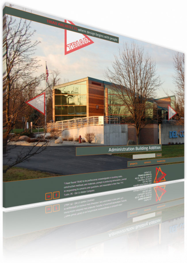 The compelling imagery produced by Triad's creative group is shown at random on the front page of the website. Upon drilldown users can explore various project images, services, and team leaders.